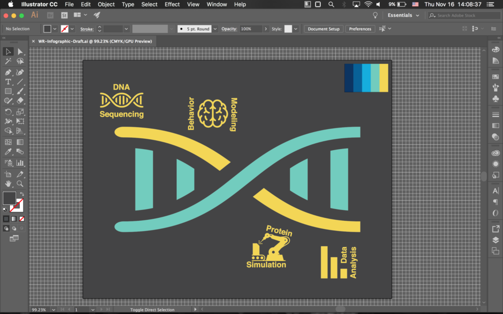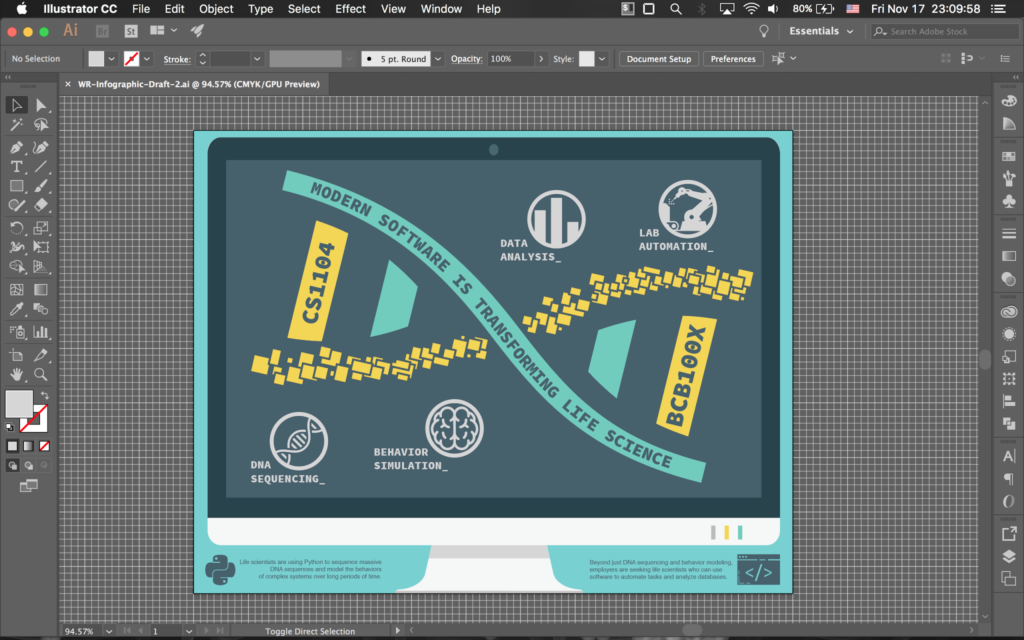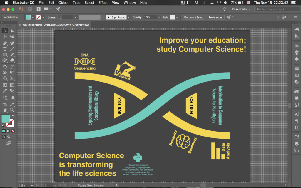 The purpose of this information graphic is to show life science students at WPI how bioinformatics and software impact biology in order to persuade them to take the CS1104 and BCB100X courses. To accomplish this, we made the central focus of the graphic a DNA helix, a choice which served both symbolic and logical purposes. DNA symbolizes biology through its fundamental association with the life sciences. Its structure consists of two intertwined strands connected by base pairs; one strand has a teal color representative of science and biology, while the other has a pixelated, digital motif which evokes the notion of computer science. These connotations, combined with the linked nature of DNA, convey the idea that computer science and biology are fundamentally intertwined. The base pairs connecting the two strands further imply a strong link between the disciplines, while providing statistics to enhance the message. The statistics point to the lack of interest in bioinformatics within the life sciences, and the financial benefits to pursuing it as a career. In addition to this data, each of the three lower icons show concrete examples of problems in biology that computer science can solve, thus providing a logical basis for taking a computer science and bioinformatics course. The entire diagram has been tilted to help guide the eye naturally along the DNA, and icons have been positioned around the molecule to provide peripheral information to the viewer as they read the headline.